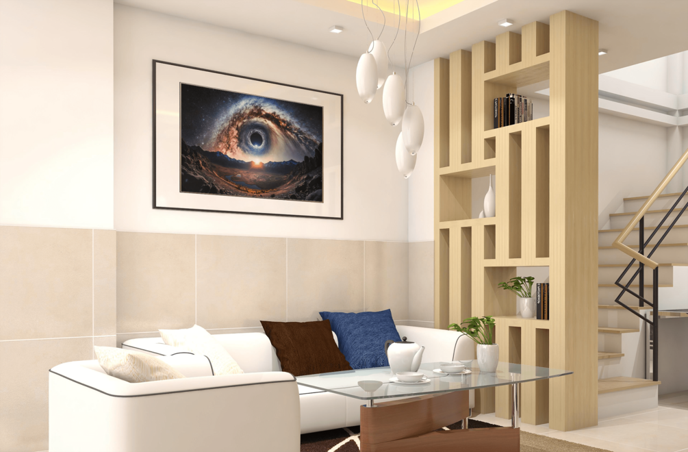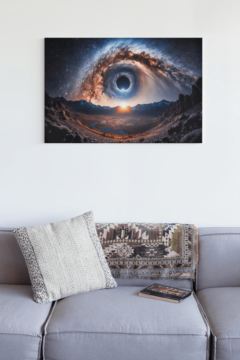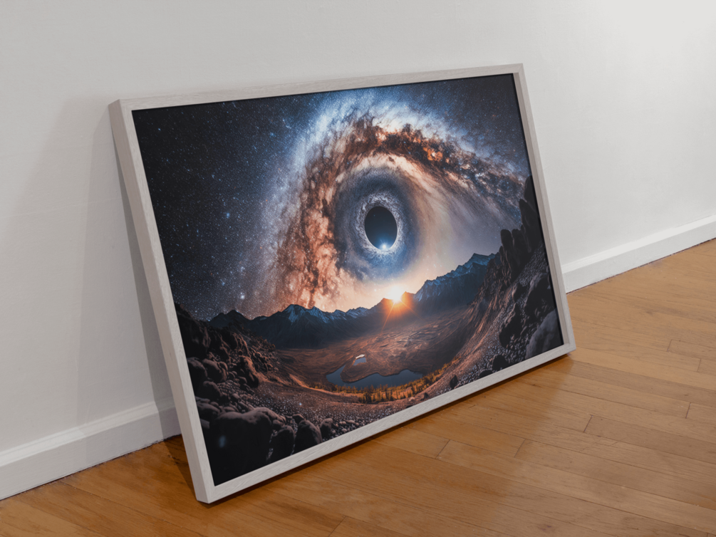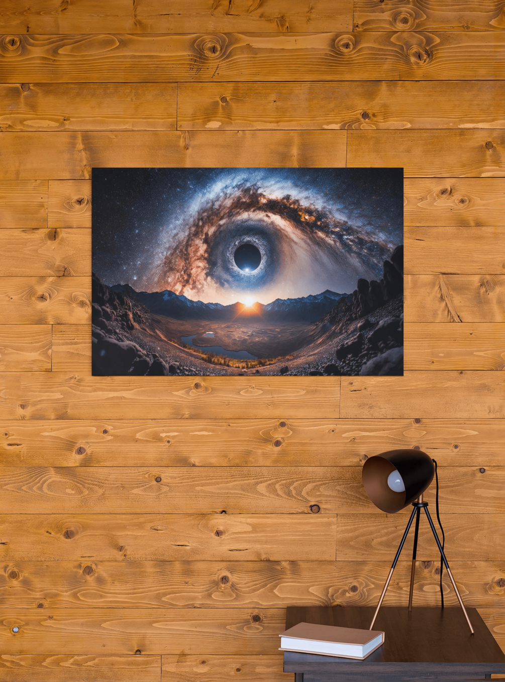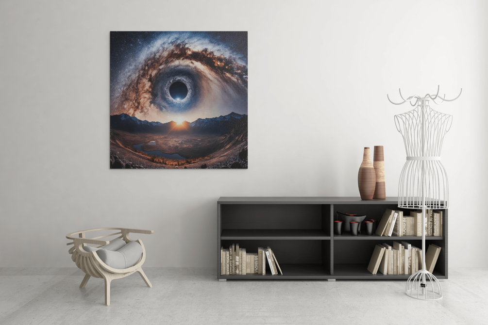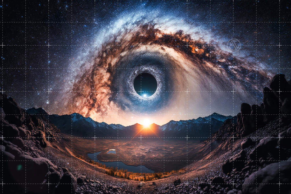 "The Beholder's Eye" is a hyper-realistic digital painting that depicts a fish-eye view of the universe as seen from a rocky volcanic crater on Earth. The stars form an eye-shaped pattern, with a black hole at the center creating the "pupil". The painting evokes a sense of wonder and excitement at the vastness of the universe and the potential for what lies beyond our world. At the same time, it also conveys a sense of the unknown and the possibility that we may be alone in the universe. Through this artwork, the artist seeks to create something bigger than all of us, a powerful reminder of our place in the cosmos.