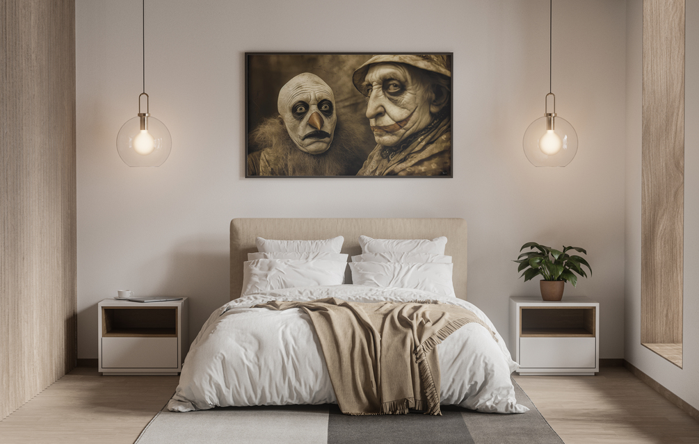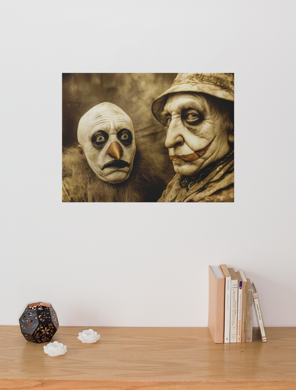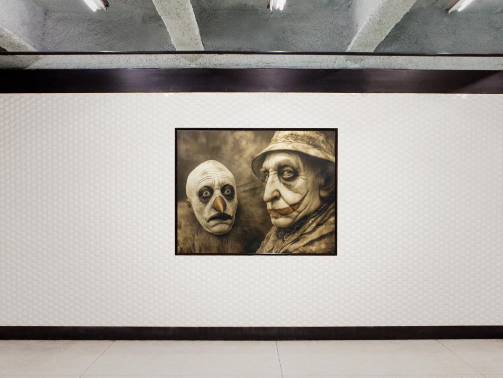 "Chilling Charades" is a hauntingly realistic photograph that captures the eerie presence of two older clowns, their murderous and sad expressions locked directly onto the viewer. The unsettling intensity of their gazes serves as a chilling reminder of the darkness that can lie behind even the most seemingly innocent masks. This powerful piece evokes a range of emotions, from discomfort to fascination, as the viewer is drawn into the mysterious world of these enigmatic characters.