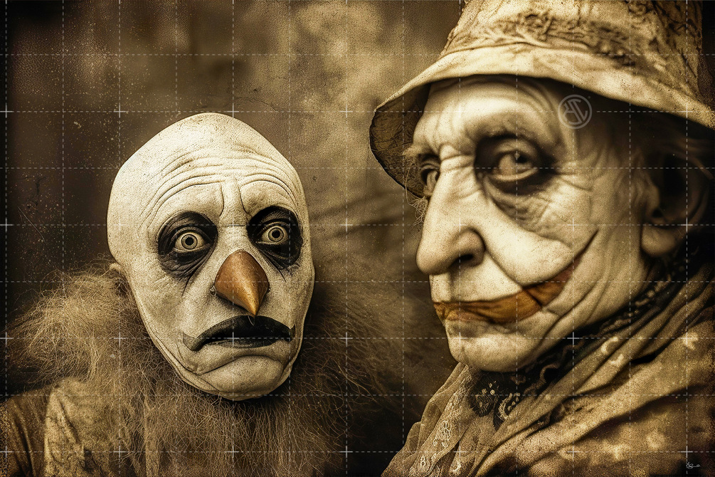 The old sepia grunge overlay adds an additional layer of depth and unease to the image, giving it a vintage, timeless quality that only enhances its sinister allure. "Chilling Charades" is a captivating and disquieting work of art, sure to provoke thought and spark conversation among viewers. This chilling depiction of clowns invites the audience to confront their fears and question the deceptive nature of appearances.