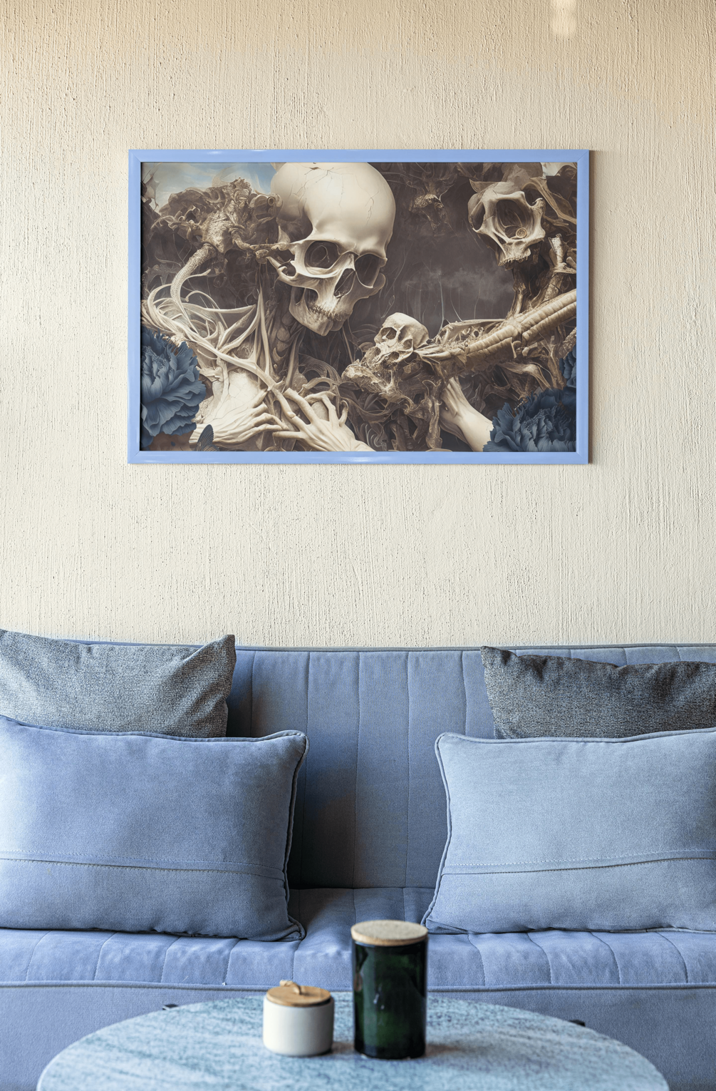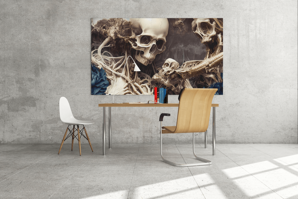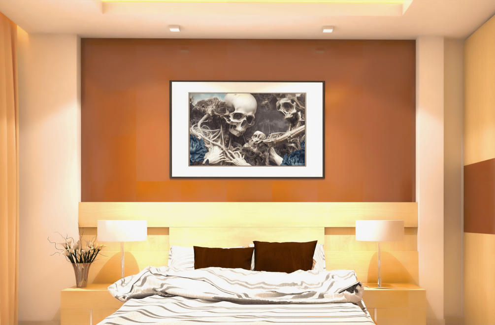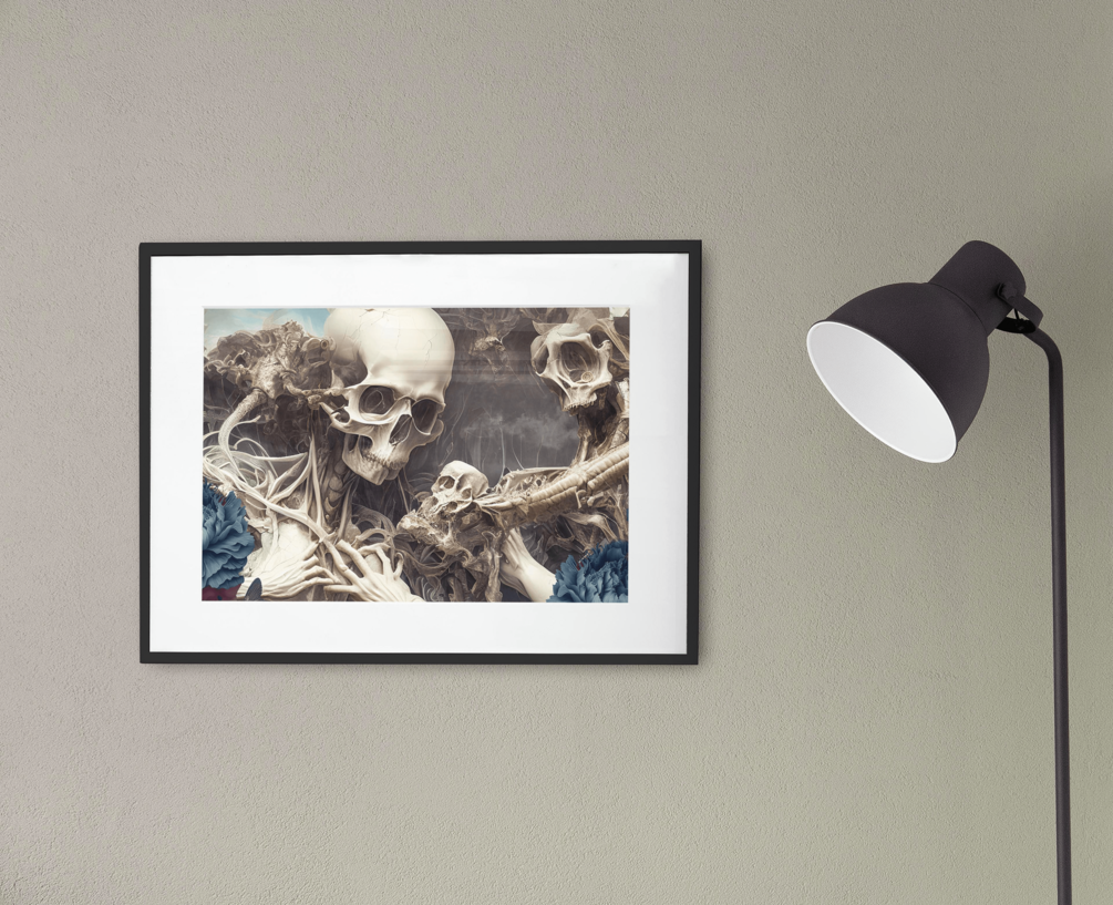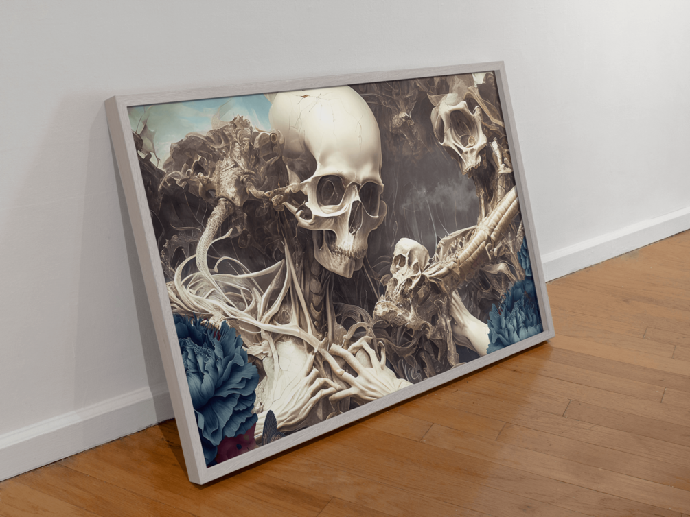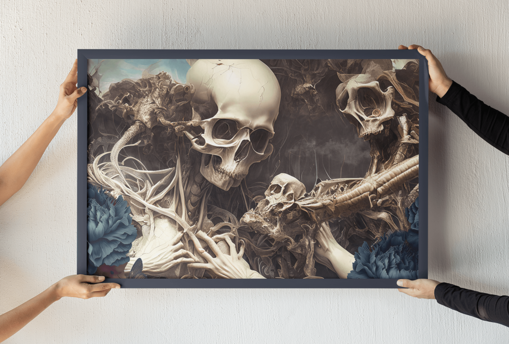 Experience the beginning of time with 'Divine Creation,' a stunning digital piece that portrays the birth of the universe in a unique and captivating way. This artwork features the interplay of flowers and skulls, symbolizing the delicate balance of life and death, creation and destruction. The vibrant colors and intricate details of this piece make it a true work of art that will draw the viewer in and invite contemplation on the mysteries of the universe. Hang 'Divine Creation' on your wall and let it inspire you every day.