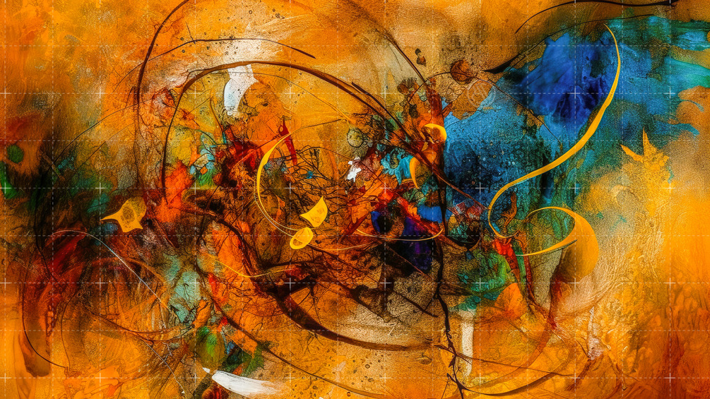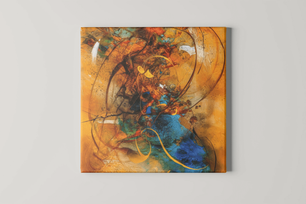 "Rust and Stardust" is a mesmerizing abstract painting that captivates the viewer with its vibrant interplay of orange and blue hues. The artist employs calligraphic abstractions, colorful complexity, and graceful forms to create a sense of movement and fluidity throughout the composition. The contrasting colors of light amber, dark yellow, and blue evoke a sense of harmony and balance, while the inclusion of rusty debris elements adds an unexpected twist to the piece.