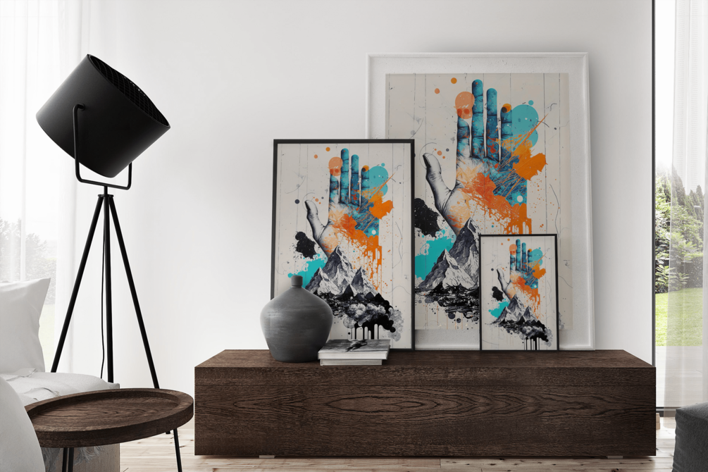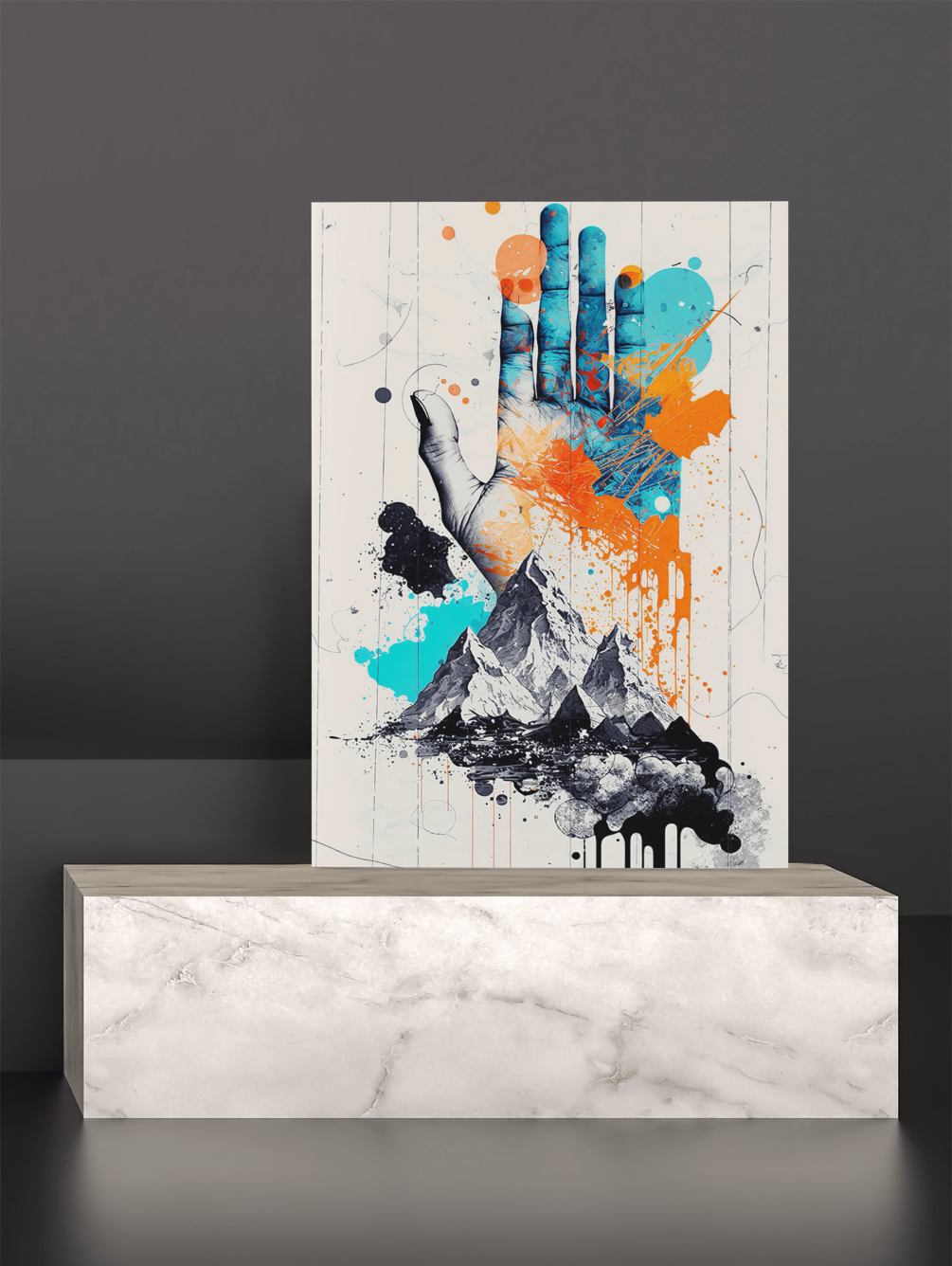 "Suspended Moments" is a striking and thought-provoking collage piece that brings together disparate elements to create a sense of timelessness and awe. The mountain range and clouds convey a sense of grandeur and vastness, while the hand in a stop-motion effect captures a sense of fleeting and suspended moments. The splatters of blue, orange, and black add an element of chaos to the piece, emphasizing the idea that there is so much in this world that we often miss in our busy lives. Through this artwork, the artist seeks to remind the viewer to slow down, appreciate the world around us, and take notice of the small but meaningful moments that make life so rich.