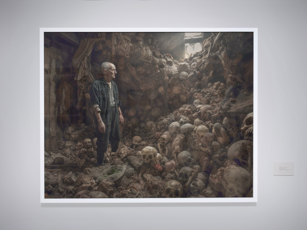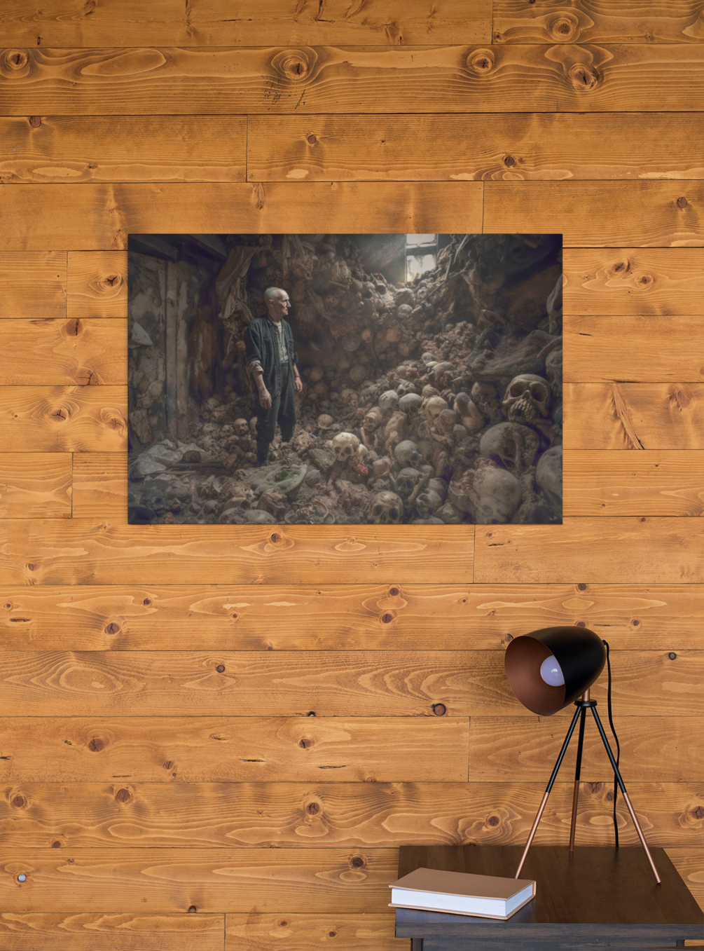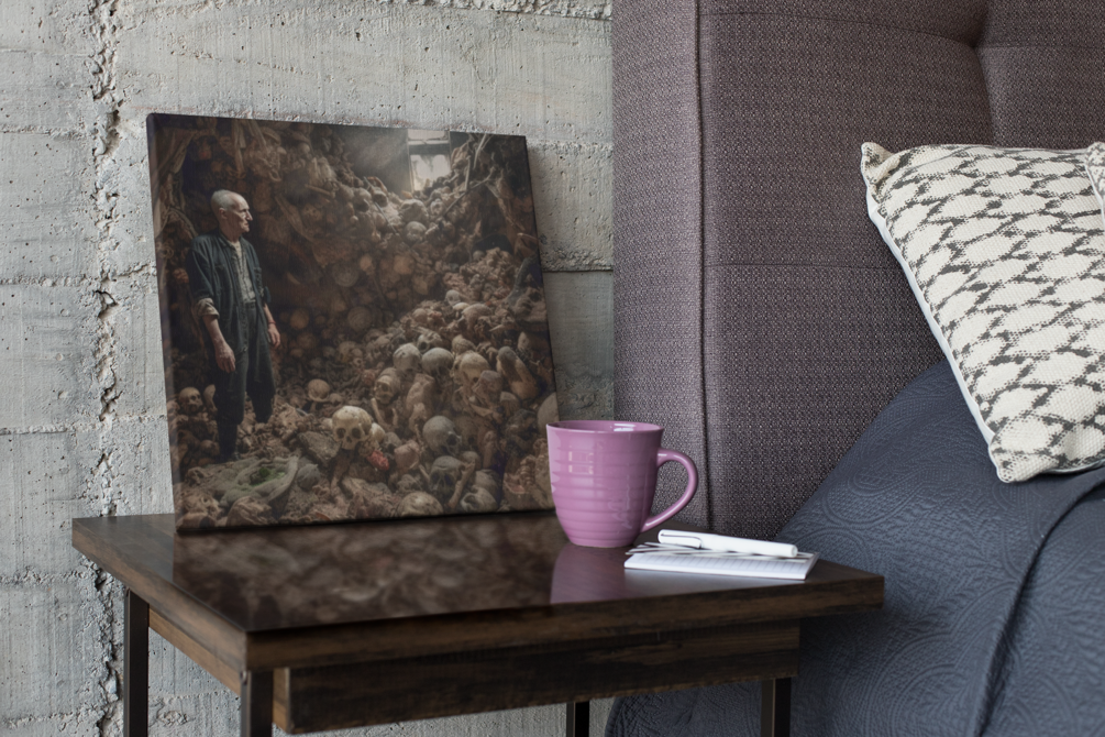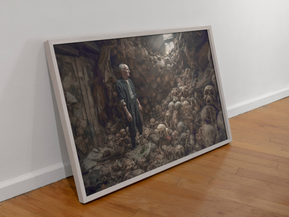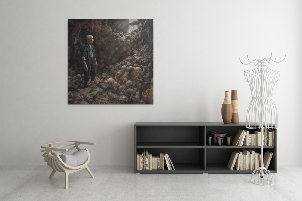 "The Bone Collector" presents a haunting spectacle, framed within the confines of a decrepit wooden room dusted with age and decay. Bathed in the light streaming through a solitary window, an elderly man stands as the sole occupant of this grim gallery, surrounded by human skulls in various stages of decomposition.