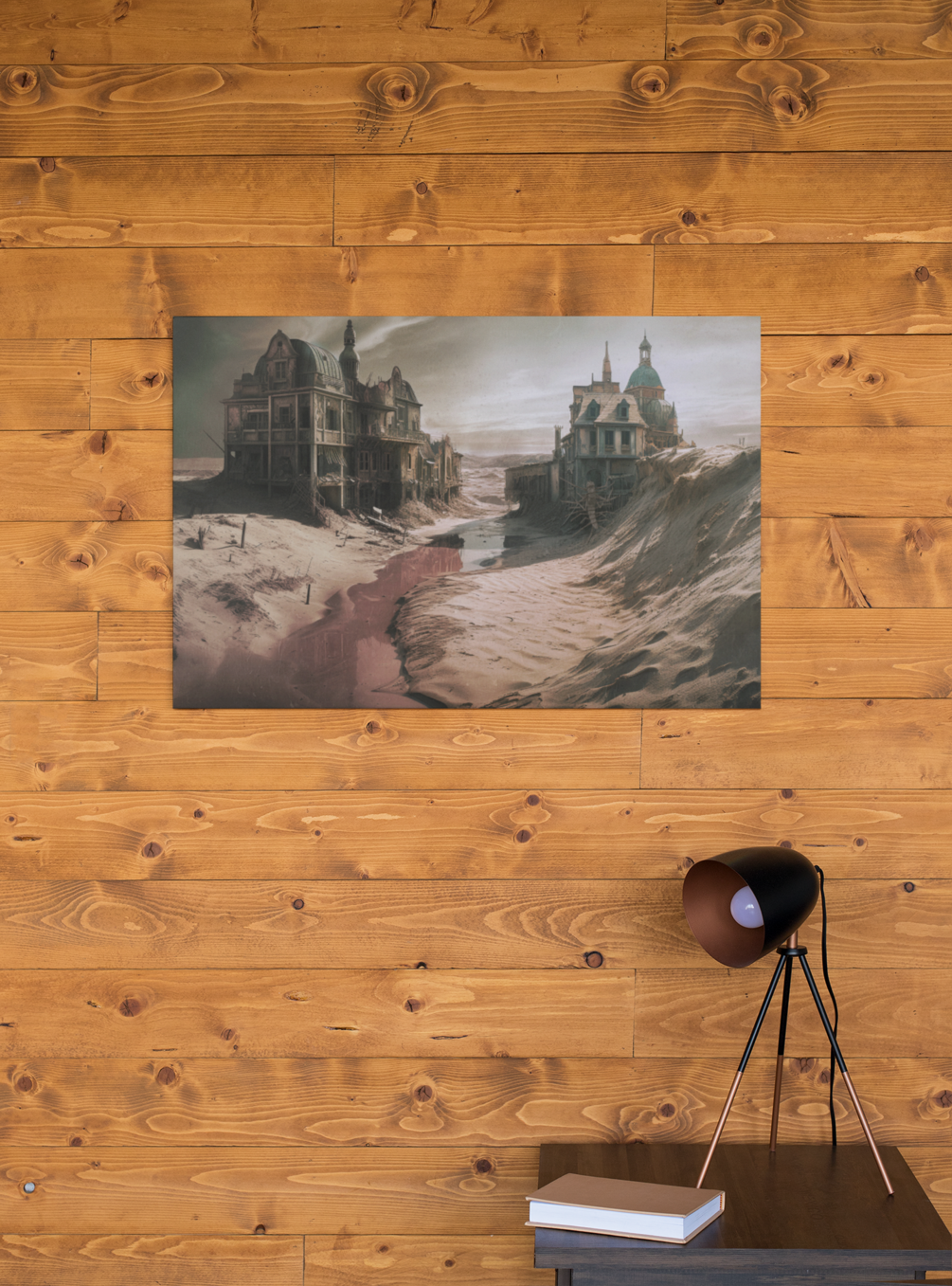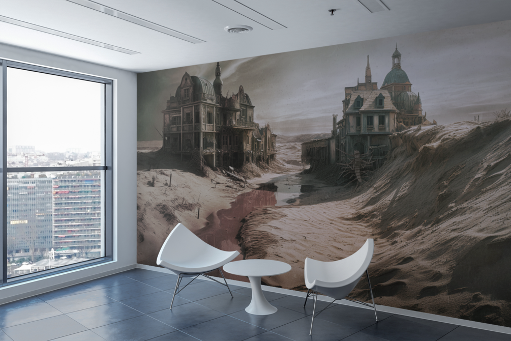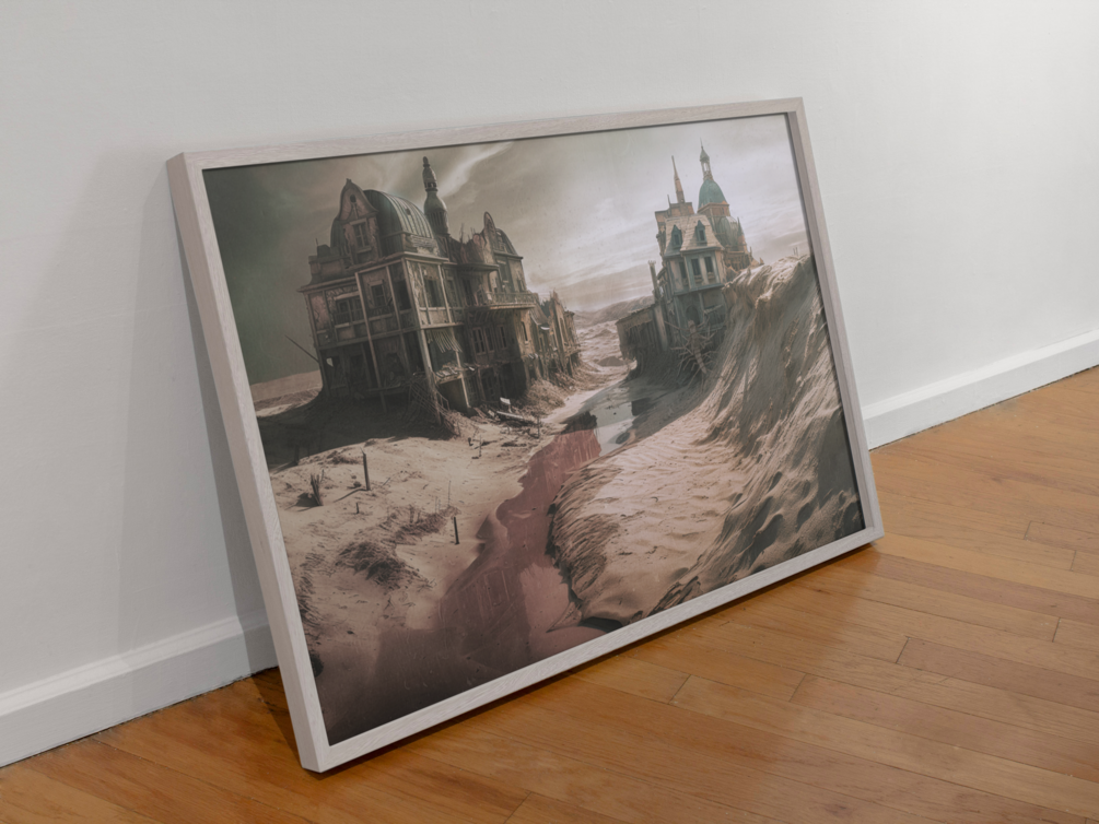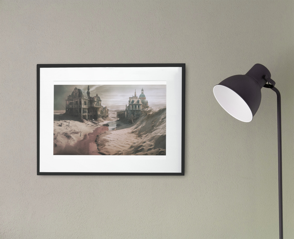 "Whispering Wasteland" is an enigmatic digital manipulation that explores the silent stories embedded within a desolate landscape. This piece transports the viewer into a post-apocalyptic world, featuring a pair of rundown houses lost within expansive sand dunes. A colossal millipede clings to the side of one house, its presence injecting an eerie touch of life into the otherwise barren scene.